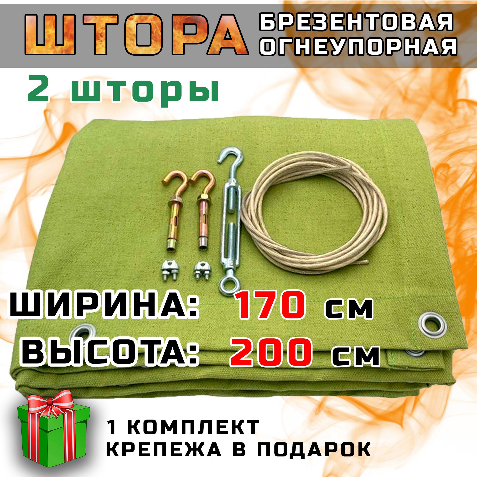 Комплект из 2 штор, изготовленных из огнеупорного брезента с люверсами подходит для использования в гараже в качестве завесы с целью защиты помещения от холода и иных воздействий внешней среды, кроме воздействия повышенной влажности и прямых попаданий осадков.Шторы изготовлены из усиленного огнеупорного брезента плотностью 420 г/кв.м, соответствует нормам ГОСТ.